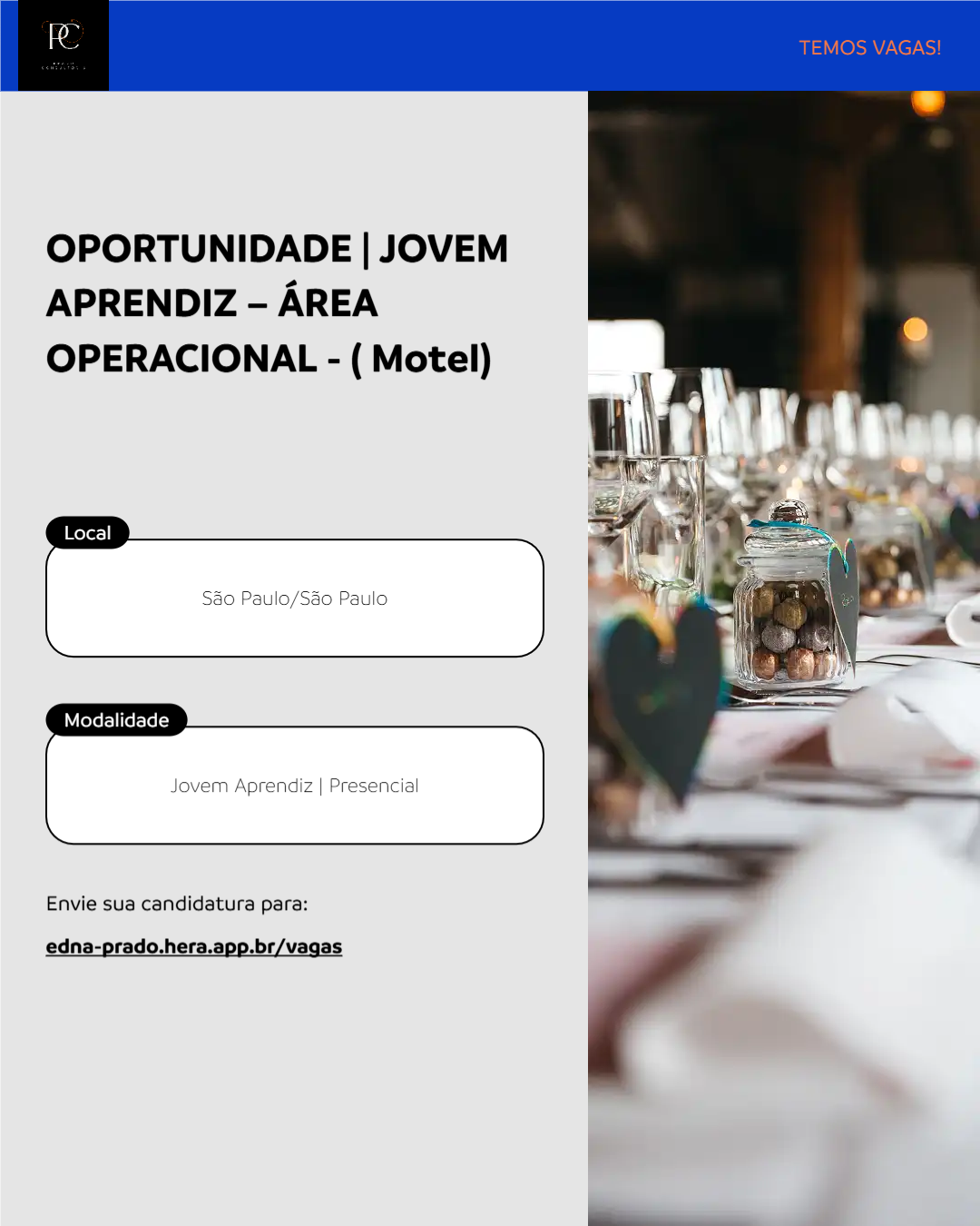 Estamos em busca de um(a) Jovem Aprendiz para atuar na área operacional de um motel. O(a) candidato(a) selecionado(a) terá a oportunidade de desenvolver habilidades práticas em atendimento ao cliente, organização de ambientes e suporte nas atividades diárias. É essencial ter interesse em aprender e colaborar com a equipe, além de ser proativo(a) e ter boa comunicação. Esta é uma excelente oportunidade para quem deseja ingressar no mercado de trabalho e adquirir experiência em um ambiente profissional.