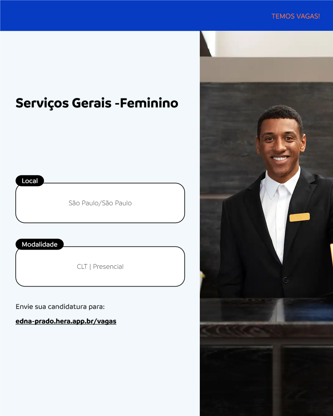 Buscamos uma Arrumadeira dedicada, organizada e responsável, para atuar na rotina de limpeza e arrumação de ambientes. A profissional será responsável por manter os espaços sempre limpos, higienizados e bem apresentados, garantindo conforto e bem-estar para todos.